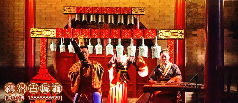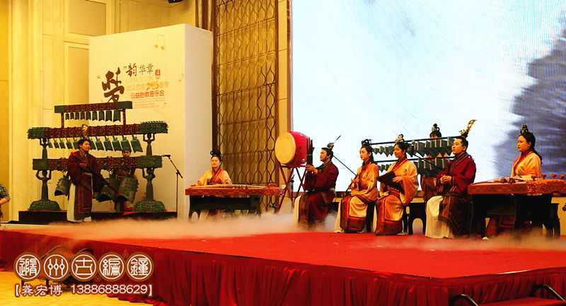 1、小型演出:一般由12-15件編鐘、編磬等配套樂器進(jìn)行表演,編鐘總長(zhǎng)度不超過(guò)2.2米,配備1-4名樂師進(jìn)行演奏,舞臺(tái)要求3*3米以上,有伴奏音樂配合演出,適合室內(nèi)小型宴會(huì)、展會(huì)等環(huán)境使用。