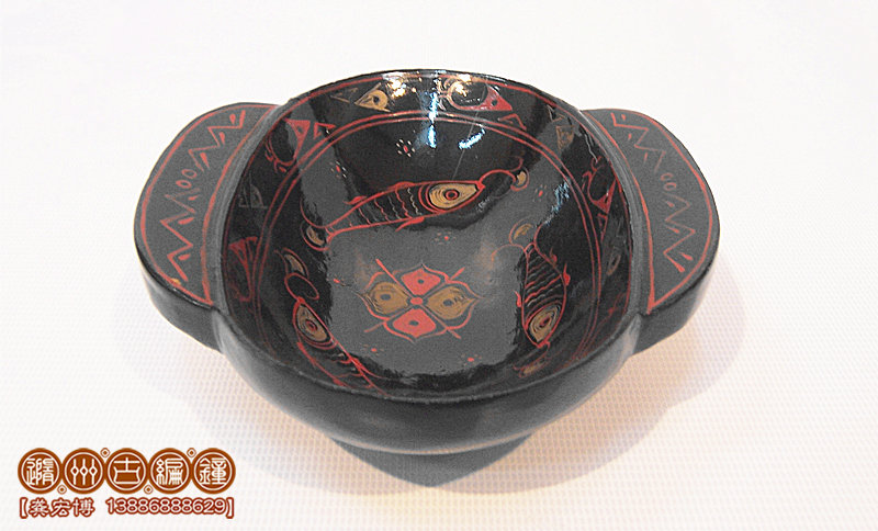 彩繪鳥(niǎo)云紋耳杯做得輕便靈巧,黑紅兩色對(duì)比明顯,云紋流動(dòng),龍飛鳳舞其中。古人飲宴,必伴以音樂(lè)鼓瑟,方能賓主盡興。古人禮儀,以雙手執(zhí)耳杯飲酒,不似今人單手執(zhí)杯。